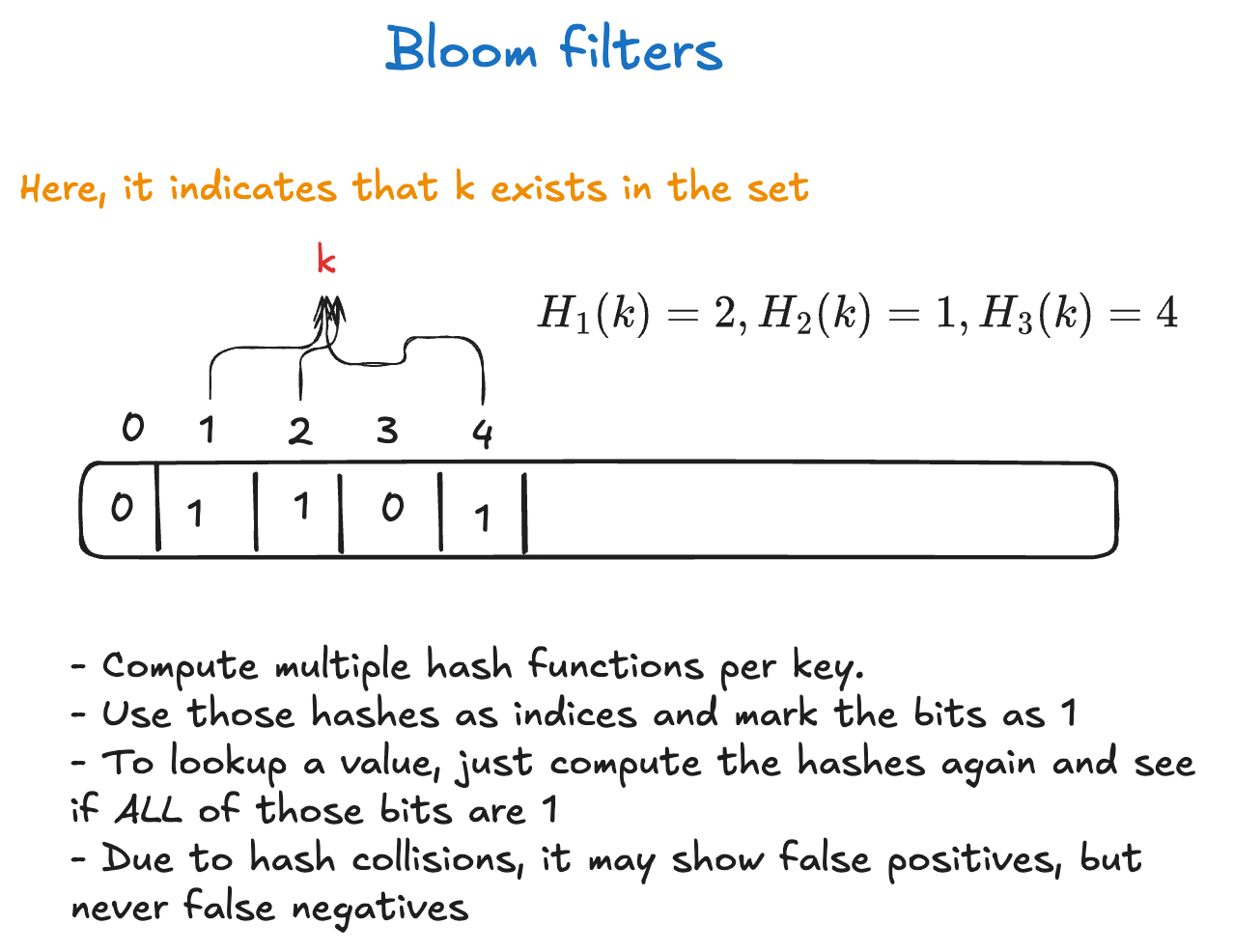 - Bloom filters to quickly check if a key is likely present in an SSTable, avoiding unnecessary disk reads.
